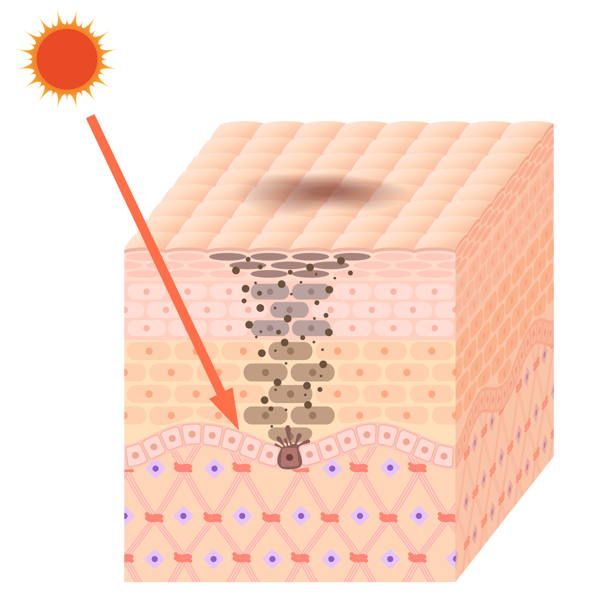しかしながら、長期間に渡って紫外線を浴び続けると、メラニン色素を作る細胞(メラノサイト)が局所的にメラニンを過剰に生成するようになり、シミへと発展します。