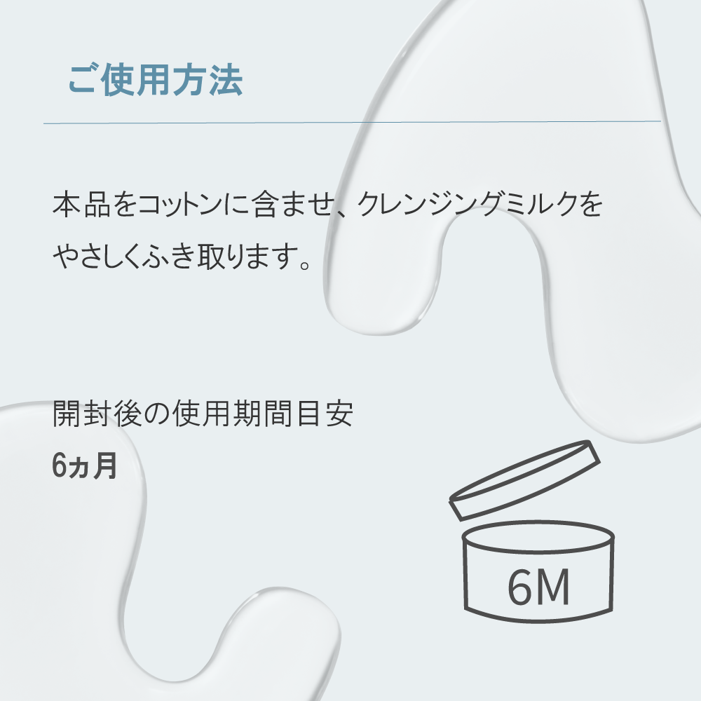 本品をコットンに含ませ、クレンジングミルクをやさしくふき取ります。