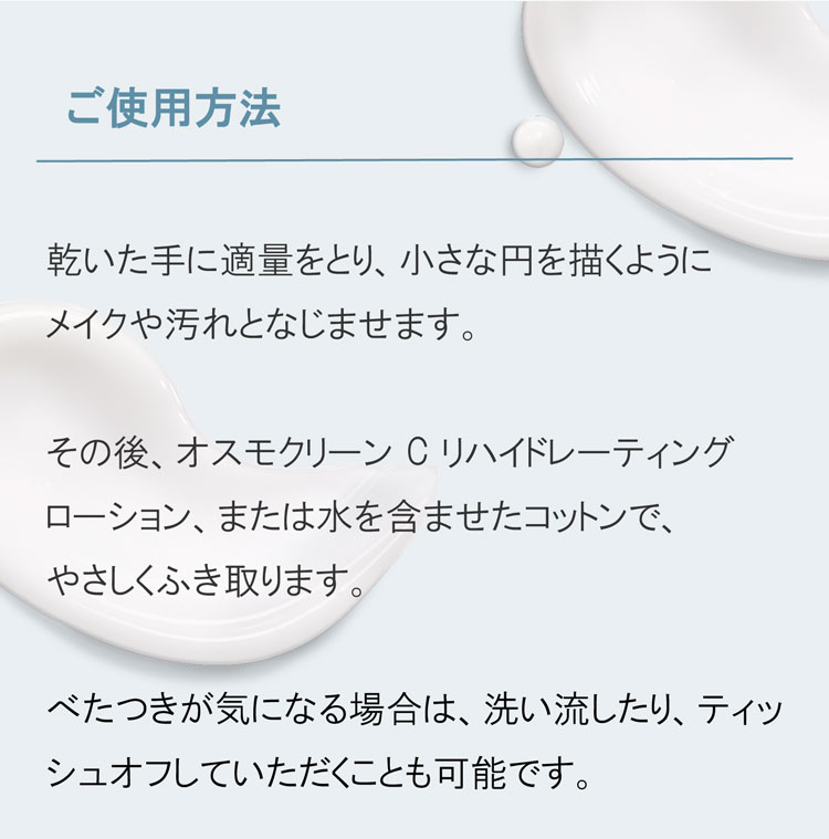 乾いた手に適量をとり、小さな円を描くようにメイクや汚れとなじませます。