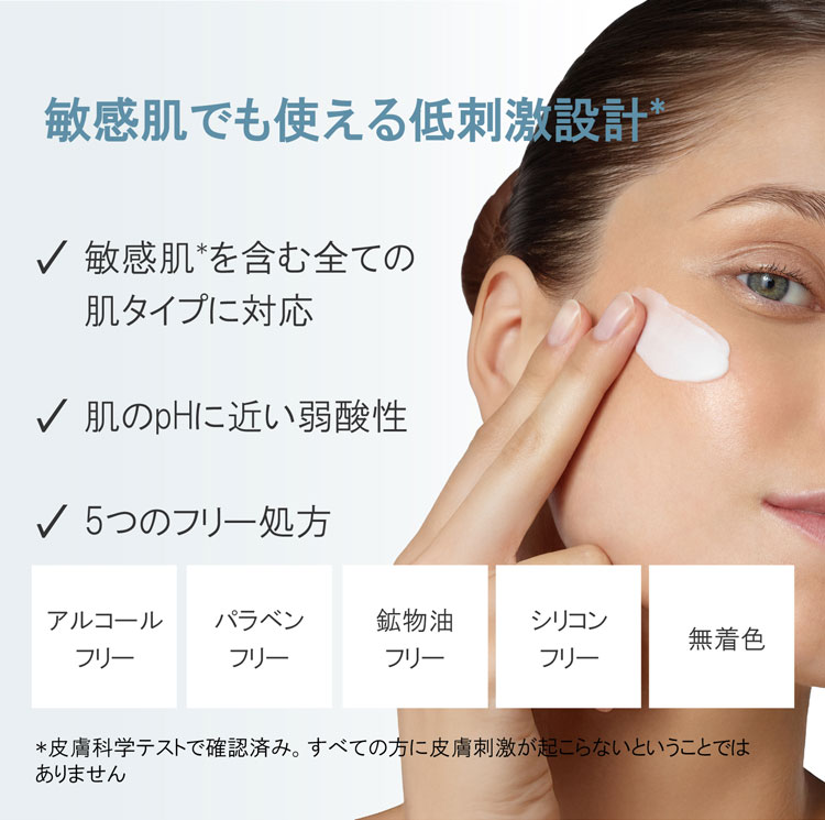肌のpHに近い弱酸性で、アルコールフリー・パラベンフリー・鉱物油フリー・シリコンフリー・無着色の処方です。
