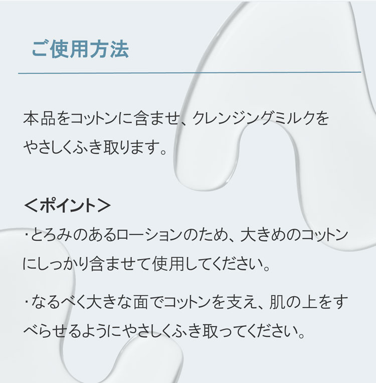 本品をコットンに含ませ、クレンジングミルクをやさしくふき取ります。